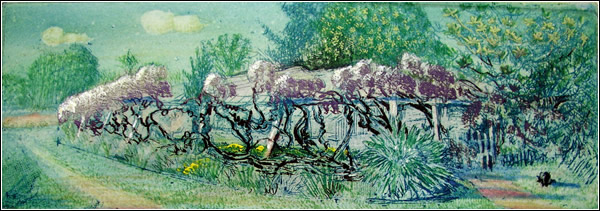 Herb Garden, Fulham Palace with Wisteria, Mimosa and cat.