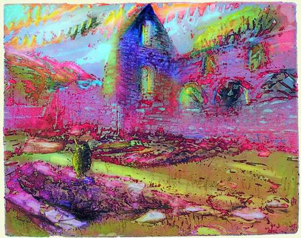 Dawn on Iona: Elm behind a ruin with Eagle owl